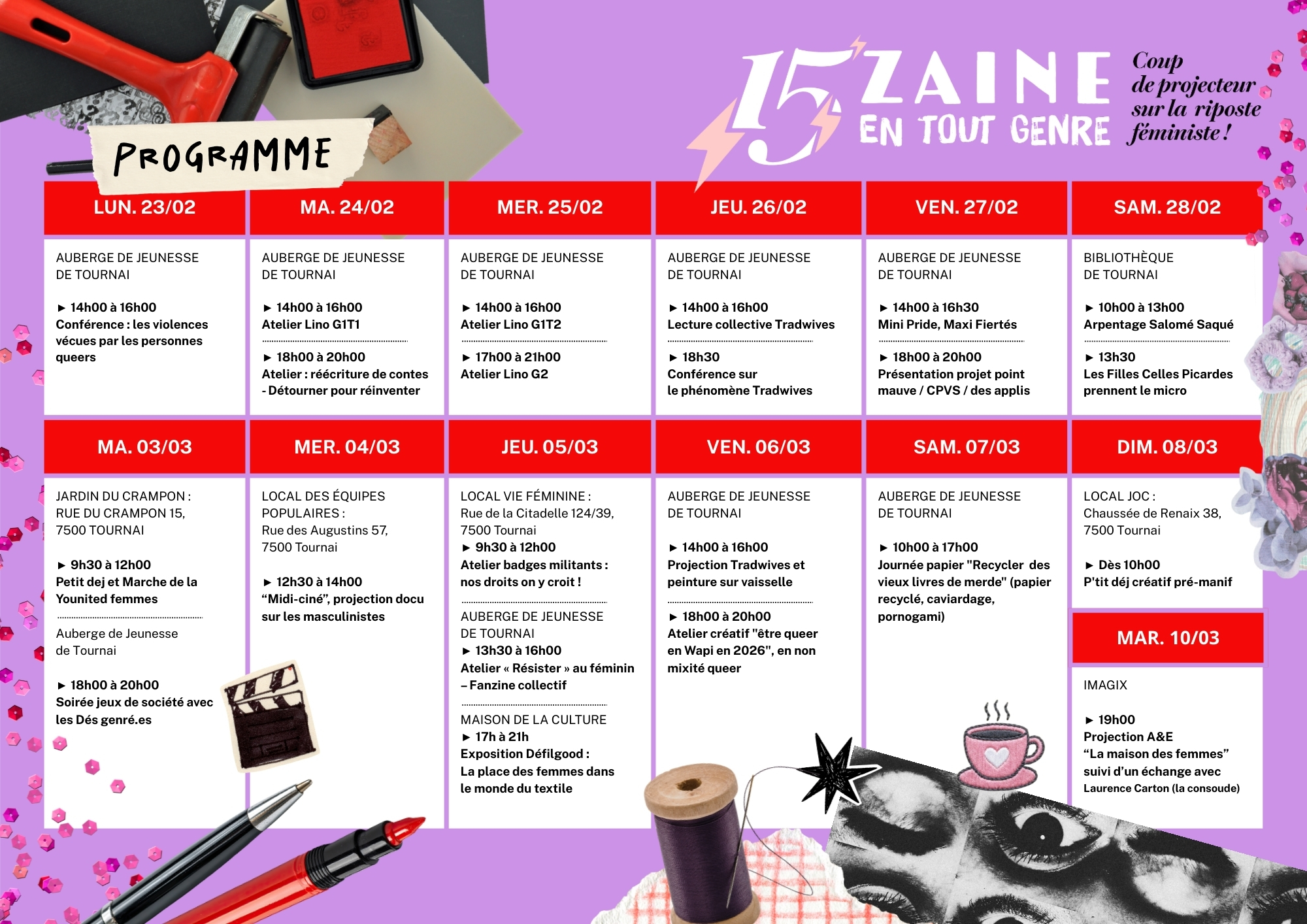 Du lundi 23 février au mardi 10 mars, la Quinzaine en Tout Genre fait son grand retour à Tournai. Pour cette deuxième édition, l’initiative associative revient plus audacieuse, plus créative et plus flamboyante que jamais. Pendant deux semaines, une programmation engagée invite à résister collectivement au retour des valeurs conservatrices et rétrogrades qui menacent les droits et les libertés.